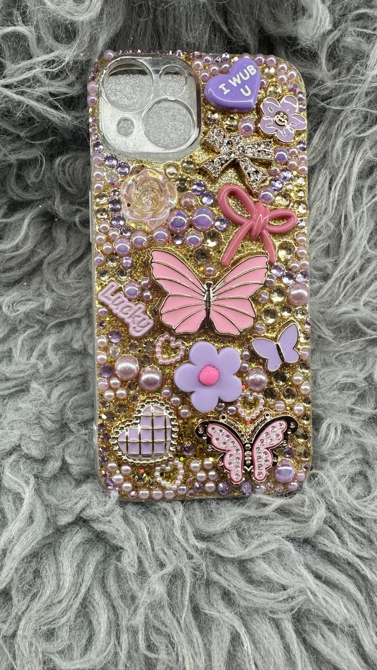 IPhone 14 gold pink purple 1 of a kind bling bedazzle case handmade ready to ship please check orders are correct when purchasing ALL SALES ARE FINAL..