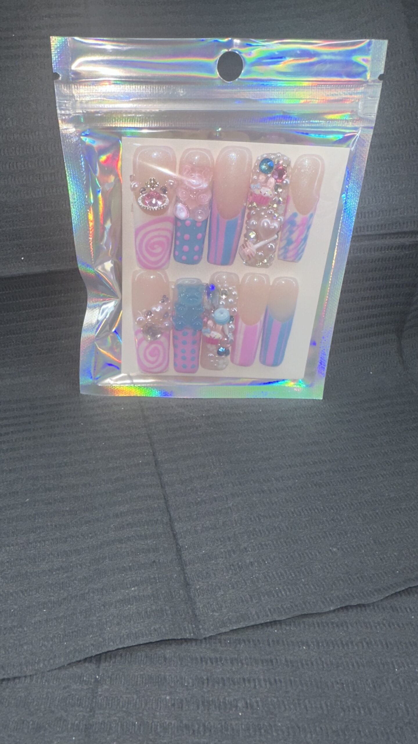 XL Candy blinged out square custom press on nails these are standard medium size nails (from thumb to pinky) 1,5,4,6,8 you will receive 10 nails no extras if your nails are not these sizes too small or too big please email us for custom nail sizes! Must know your sizes all sales are final!!!